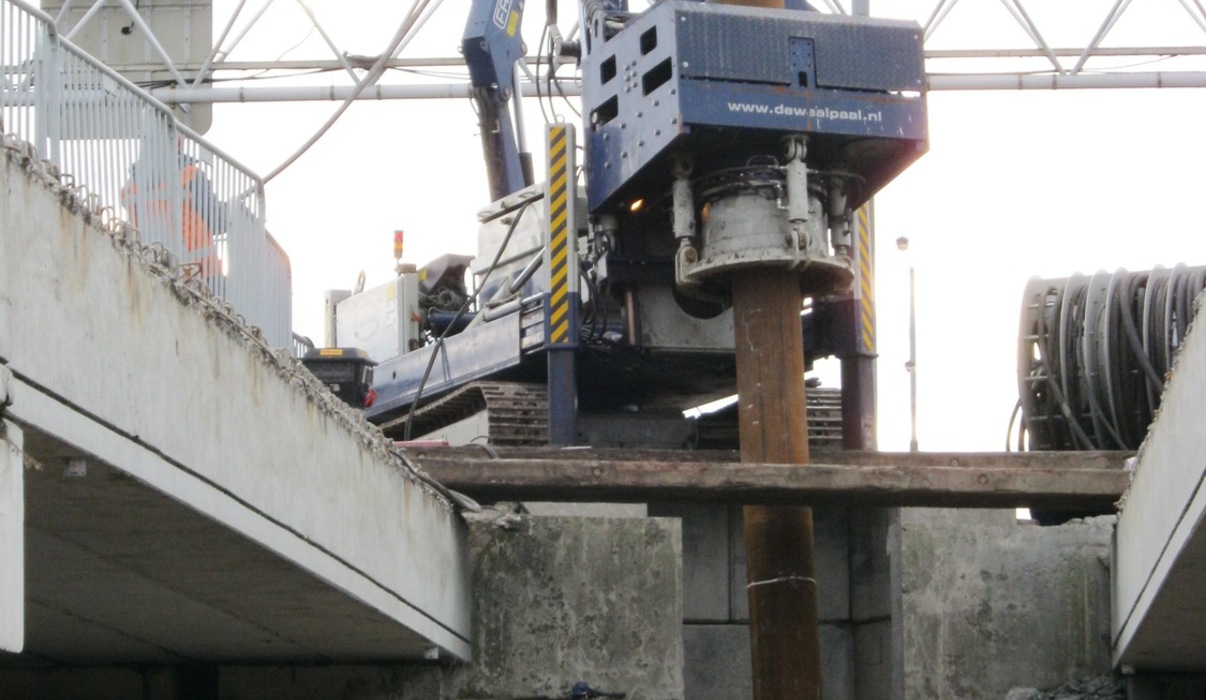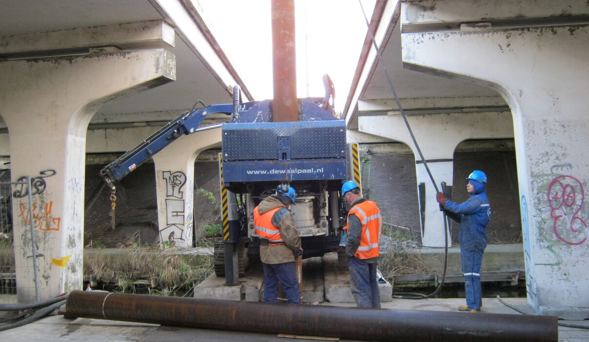 Bij het viaduct Sluisbuurt zijn casing draaipalen met groutinjectie geboord met een lengte van 24 meter. Met de machine stonden we onder het viaduct om de palen in delen te boren.