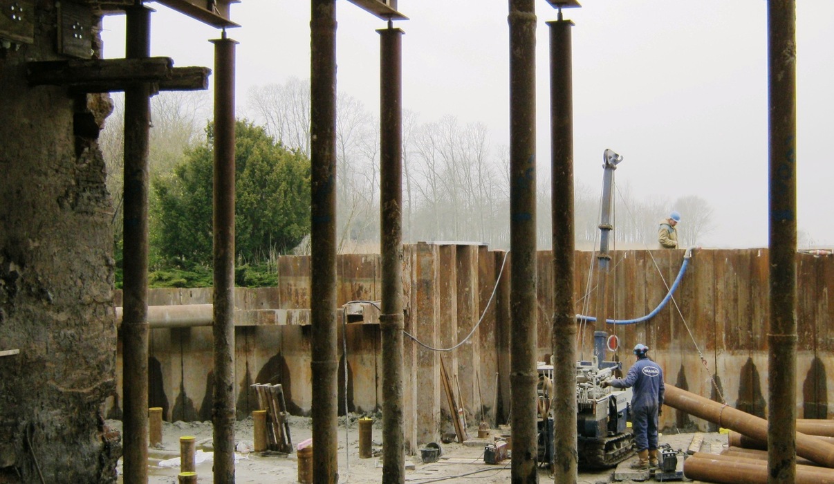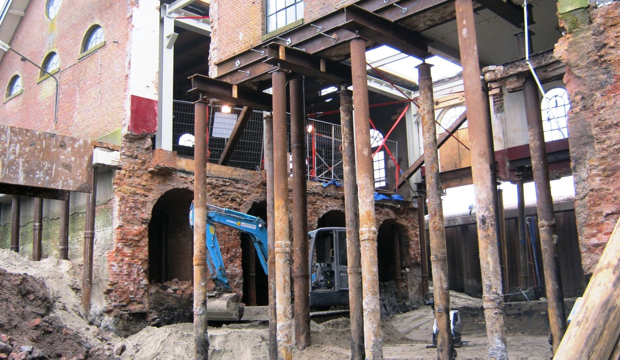 De Waalpaal heeft voor dit project bijna 200 stalen buispalen geplaatst Ø219mm¹ en Ø324mm¹ van tot 14 meter lang. De stalen buispalen zijn door de oude vloeren en gewelven geheid, en zijn vervolgens in een nieuwe betonvloer gestort. Door inkassingen in de bestaande gevels is de belasting overgedragen op de nieuwe palen.